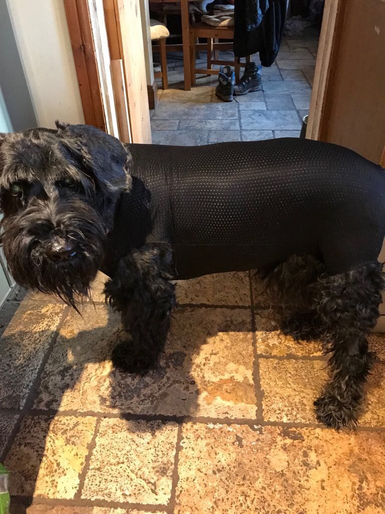 These bandages comprise of a body garment with additional coverage based on the pathology or needs of the clinician. Clinicians can choose to provide additional support around the dog’s abdomen.